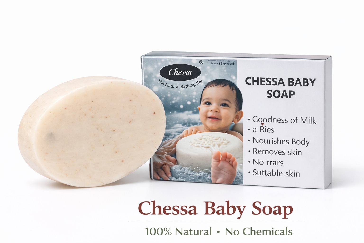 Chessa Baby Soap – Gentle Natural Care for Delicate Skin . Specially crafted with the goodness of milk and natural ingredients, Chessa Baby Soap gently cleanses and nourishes your baby’s delicate skin. Its mild, chemical-free formula helps keep skin soft, smooth, and healthy, making it perfect for everyday bath time care.