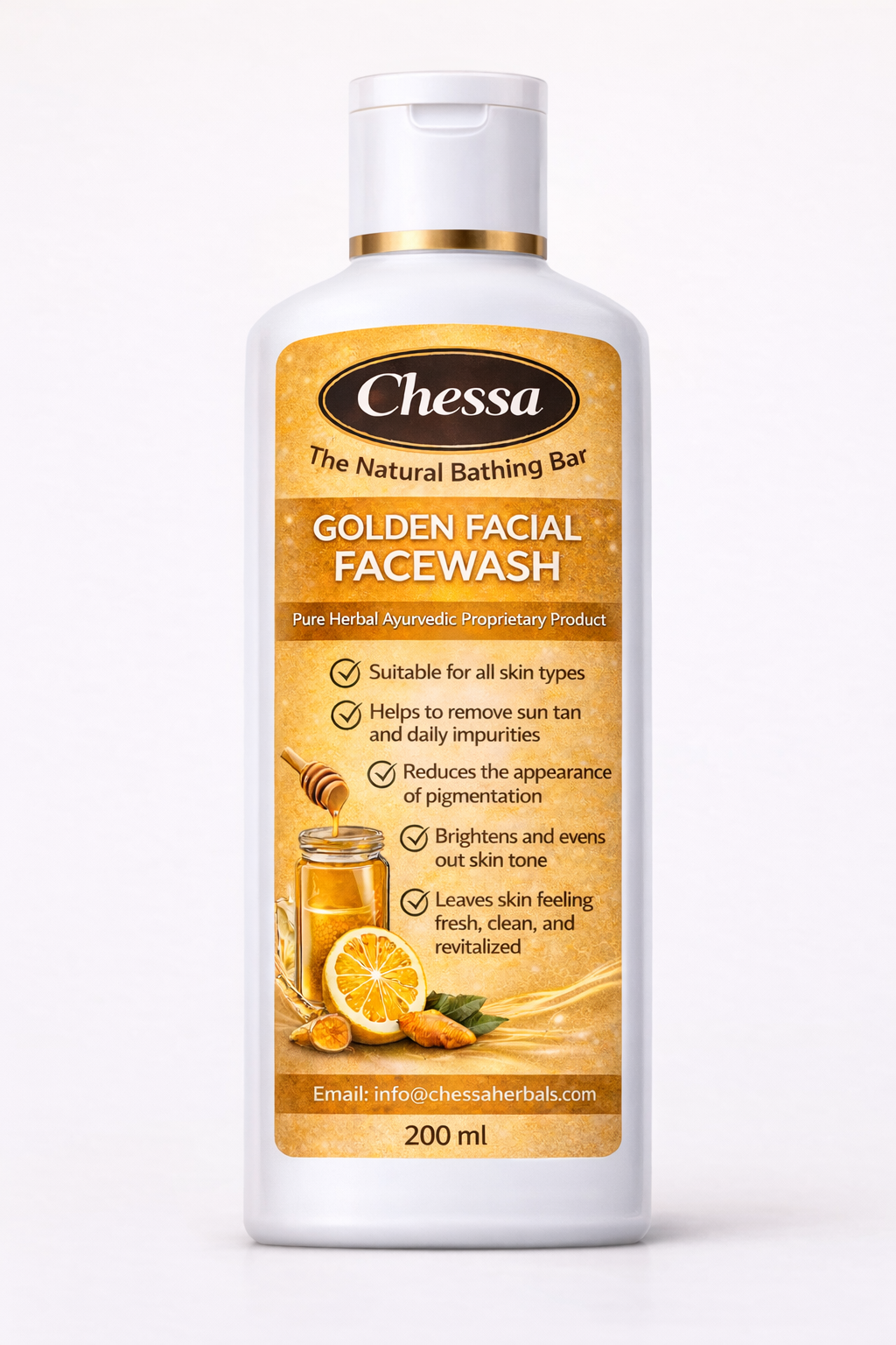 Chessa Golden Facial Facewash is formulated with natural and herbal ingredients to gently cleanse the skin while effectively removing sun tan, excess oil, and daily impurities. It helps reduce the appearance of pigmentation and dullness, revealing a brighter and more even-looking skin tone.